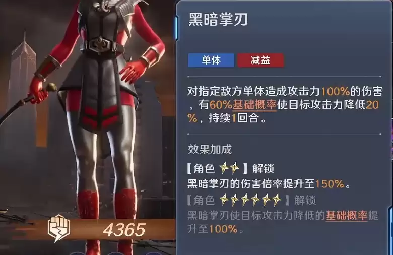 具体来说,主动技“黑暗操控”可让自身以及相邻的队友提升20%的攻击力;若队友为古阿帝国势力的角色,还可额外让他获得能量恢复效率提升10%的效果。这是一个既通用,又能让同势力角色获得额外收益的技能。另一个主动技“黑暗掌刃”则可在对敌方单体造成伤害的同时,以60%的基础概率降低它的攻击力,让它无法打出太高的输出。因此亡灵魂姬娜在战斗中通常会向敌方的主要输出点释放这个技能。此外,在亡灵魂姬娜升至6星后,原本60%的基础概率会提升至100%,这意味着她每次攻击必定会给敌方目标挂上降低攻击力的负面状态。