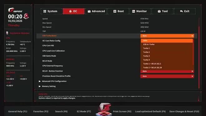 超频设置界面也很清爽,可以设置处理器倍频,处理器电压等。其他的功能,比如PBO 2调节、Curve负压调节、X3D Game Mode设置等功能,七彩虹X870E火神的BIOS中一应俱全,调节选项丰富而直观,很方便玩家进行超频操作。