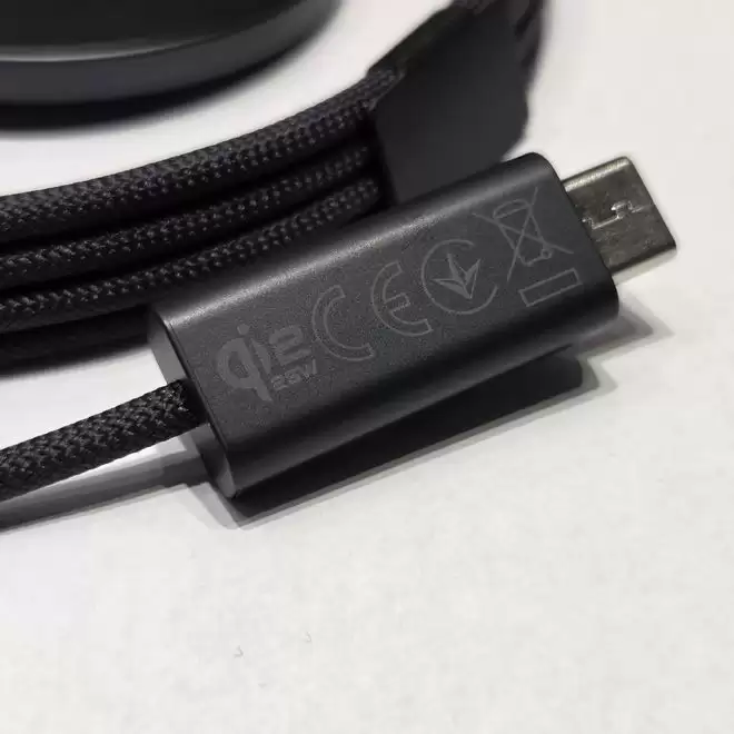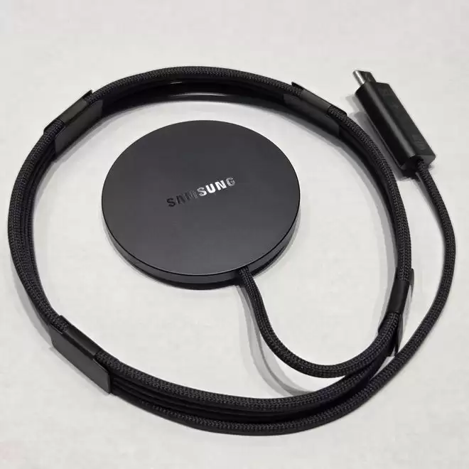 从曝光的标识来看,这款充电器一端配备了USB Type-C接口,另一端则是圆形的磁吸无线充电盘,连接线缆采用了尼龙编织材质。产品预计上市时仅提供一种配色,三星建议用户将其与45W USB PD充电器搭配使用。