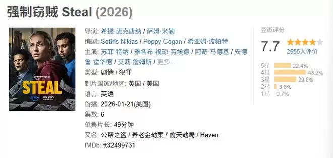 这就是前几天开播的英剧《强制窃贼》,豆瓣评分7.7分,作为爽剧,这个分数也够了。