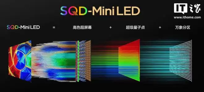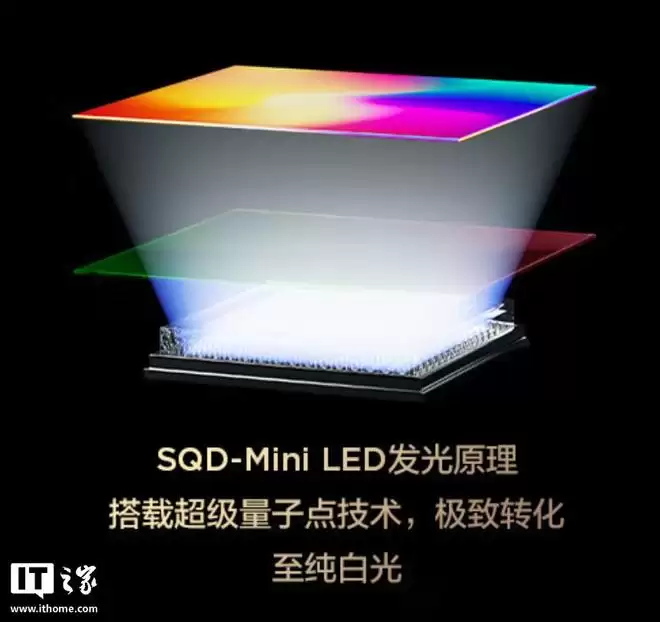 光源架构的革新:不同于传统 RGB-Mini LED 需要红绿蓝三颗芯片混合发光(容易产生色域漂移和串色),SQD-Mini LED 采用单灯发光,通过背光激发超级量子点材料发出纯净的单色光。这种方式从物理底层保证了光源的一致性,消除了色彩串扰。