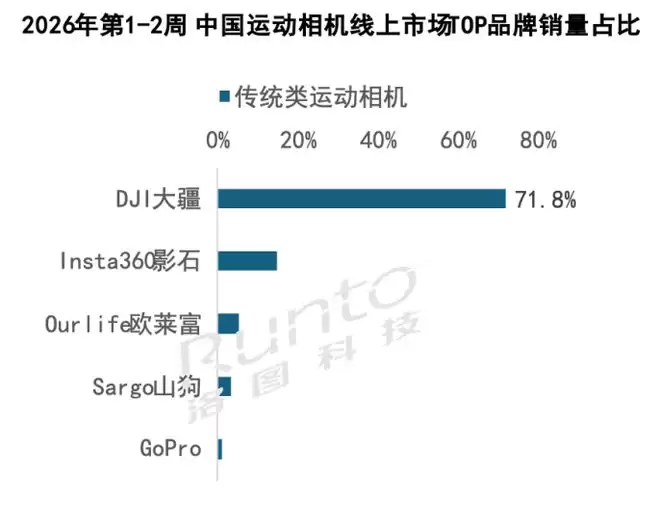 根据洛图科技发布的《中国运动相机线上零售市场追踪》首期双周报,2026 年第 1-2 周(12 月 29 日-1 月 11 日),中国线上市场运动相机销量达 8.4 万台,销售额 1.9 亿元。在这份报告中,大疆展现出了压倒性的市场统治力。