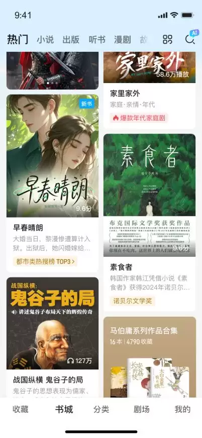 全新客户端构建“书城”“剧场”双频道,并于“书城”频道采用双瀑布流展示模式,将海量图书与精品微短剧可视化同步呈现,用户滑动间即可实现文剧场景无缝切换。
