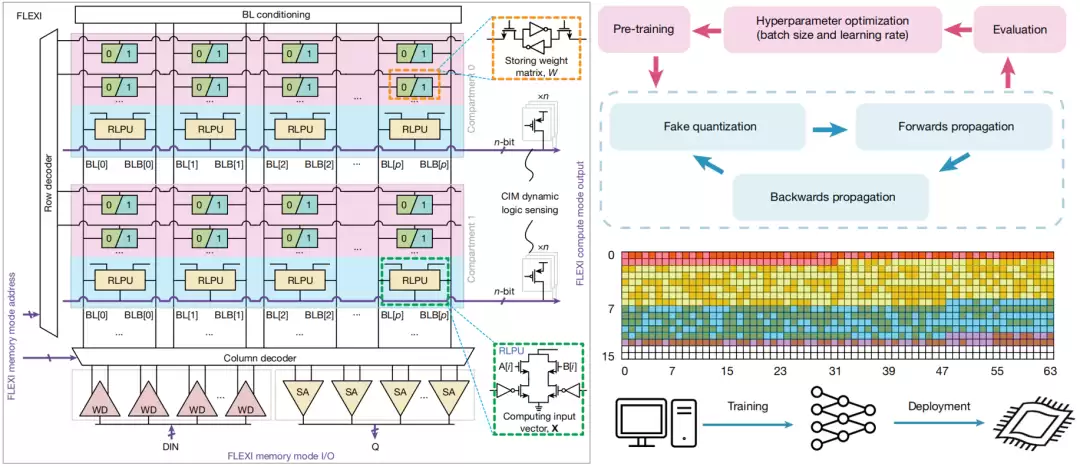 FLEXI采用了模块化、可扩展的数字存算架构。每个基本功能模块由6晶体管静态随机存取存储器单元及嵌入式可重构本地处理单元构成,能够支持稳定、高速、并行的点积运算。得益于覆盖制造工艺、电路设计和算法实现的多层级协同优化策略,FLEXI芯片即使在工艺参数波动或存在机械应力的条件下,依然能保持卓越的计算精度、面积效率和能效表现,并能够高效支持神经网络推理中的单指令多数据流运算。
