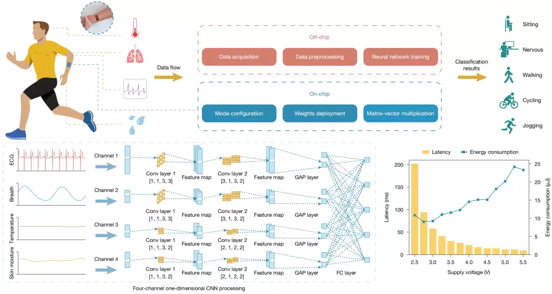 在应用验证方面,研究团队将FLEXI用于日常活动的连续监测与识别,展示了其在可穿戴健康监测和多模态传感器片上计算中的应用前景。团队采集了受试者处于不同状态下的心率、呼吸频率、体温和皮肤水分等多模态生理信号,构建了轻量级四通道卷积神经网络模型,并在FLEXI-1芯片上实现了一次性片上部署。通过量化感知训练,该模型在测试集上实现了高达97.4%的分类准确率。