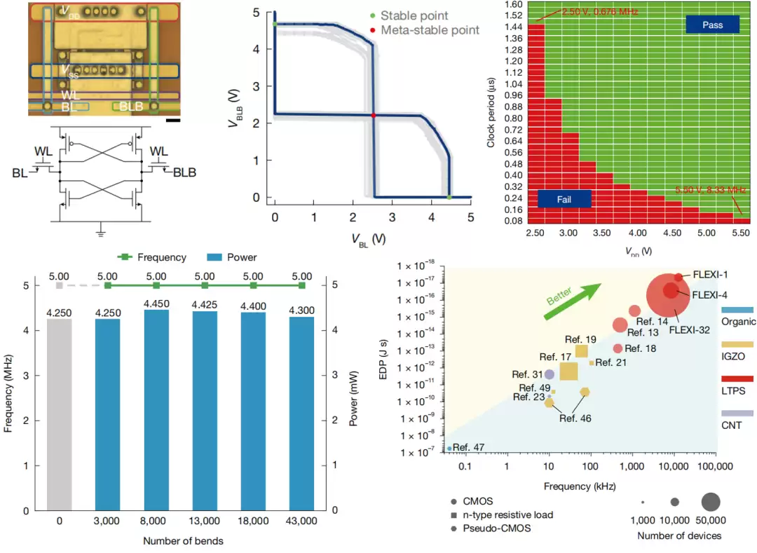 实验结果表明,FLEXI芯片可在2.5至5.5伏的宽电源电压范围内稳定工作,并且在半径为1毫米、弯折180度的严苛条件下,历经超过4万次弯折循环后,其核心性能未出现明显衰减。