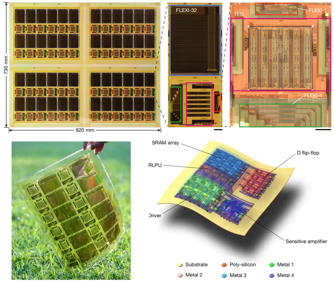 根据清华大学发布的最新技术详解,FLEXI芯片采用低温多晶硅互补金属氧化物半导体工艺制造,兼具轻薄、低成本和高能效等显著优势。该系列产品包含FLEXI-1(1千字节)、FLEXI-4(4千字节)和FLEXI-32(32千字节)三种规格。其中集成度最高的版本,单颗芯片上可集成约26.5万个晶体管,在单一柔性基底上实现了静态随机存取存储器、计算单元与外围电路的高度集成。