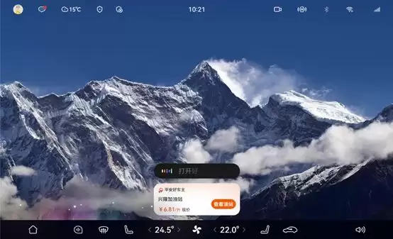 1.车辆进入加油站,挂 P 档后,车机根据位置主动推荐“好车主加油”服务卡片。