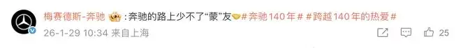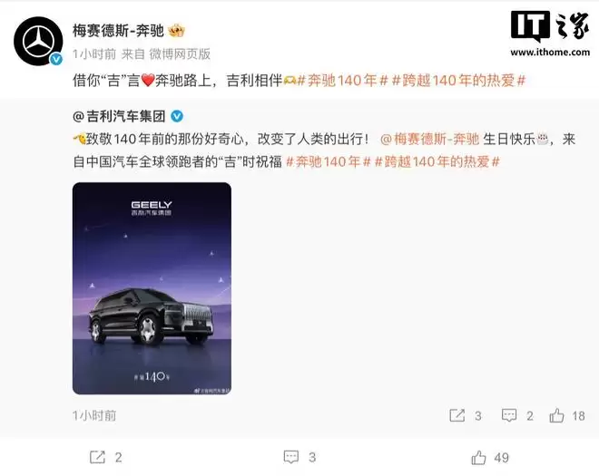 吉利汽车集团:致敬 140 年前的那份好奇心,改变了人类的出行! @梅赛德斯-奔驰 生日快乐,来自中国汽车全球领跑者的“吉”时祝福! 奔驰回复:借你“吉”言。奔驰路上,吉利相伴!