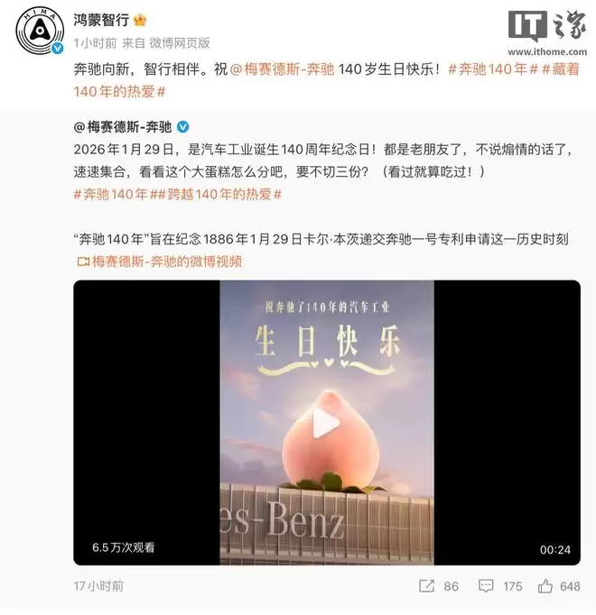 鸿蒙智行:奔驰向新,智行相伴。祝 @梅赛德斯-奔驰 140 岁生日快乐! 奔驰回复:奔驰的路上少不了“蒙”友!