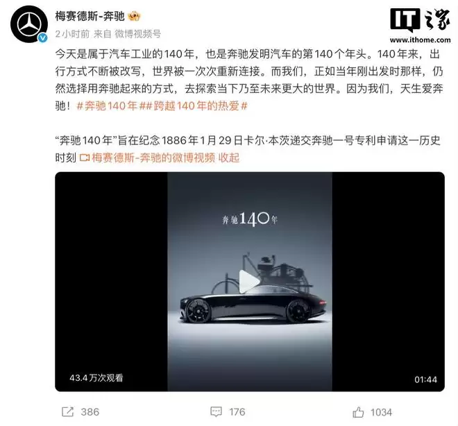 今天上午,梅赛德斯-奔驰官微发文称:“今天是属于汽车工业的 140 年,也是奔驰发明汽车的第 140 个年头。140 年来,出行方式不断被改写,世界被一次次重新连接。而我们,正如当年刚出发时那样,仍然选择用奔驰起来的方式,去探索当下乃至未来更大的世界。因为我们,天生爱奔驰!”