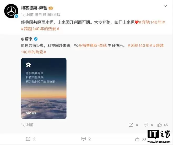 蔚来:原创共铸经典,科技同赴未来,祝 @梅赛德斯-奔驰 生日快乐。 奔驰回复:经典因共鸣而永恒,未来因开创而可期。大步奔驰,咱们未来见。