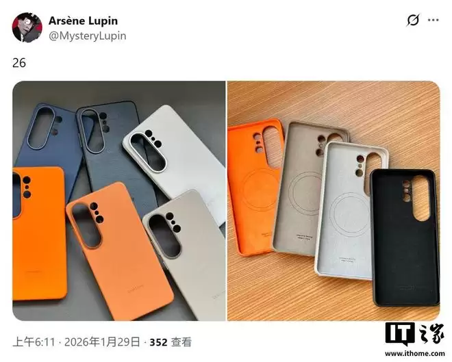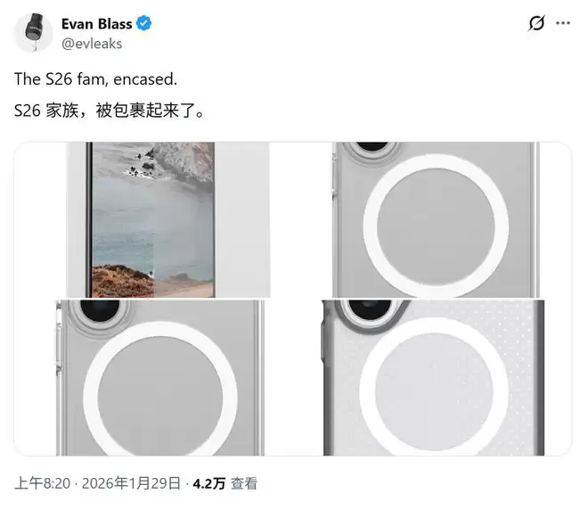 IT之家1月29日讯,爆料大神@Evleaks与@MysteryLupin于今日(1月29日)在社交平台X上发布推文,分享了一组三星Galaxy S26系列手机保护壳的渲染图。图片清晰展现了圆润的边缘设计与标志性的药丸状相机模组凸起。