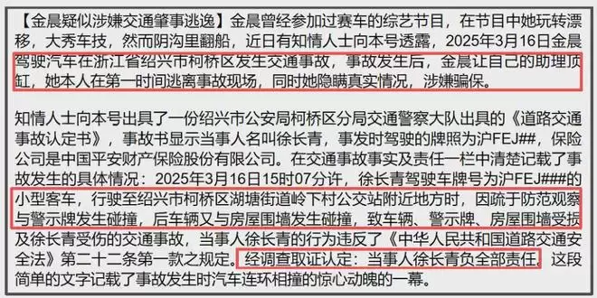 金晨因在2025年3月驾车发生交通事故后离开现场,于是被认定“肇事逃逸”,最终处以金晨1500元行政罚款,时隔一年的处罚,直接打脸洗白的粉丝,直到现在,金晨的粉丝还在喊冤,说什么金晨不是逃逸,而是紧