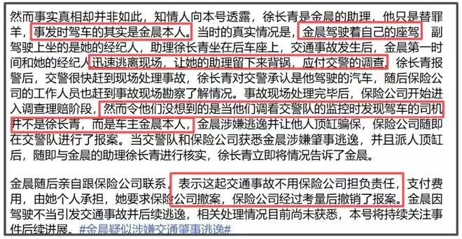 偏偏金晨要自找麻烦,从逃离现场到找助理顶包,还找保险公司要求对方撤案,每一步都踩到法律红线之上。