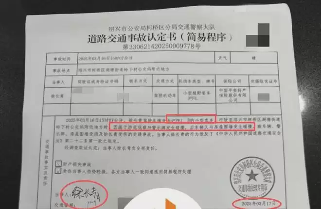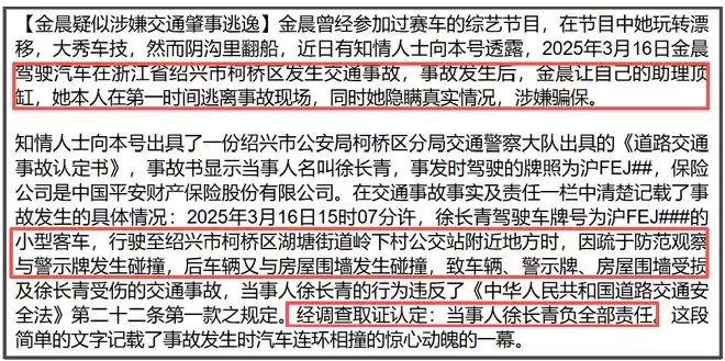 知情人士称金晨驾车在浙江绍兴发生交通事故的时间是2025年3月,事故发生后,金晨第一时间和经纪人逃离现场,让助理徐长青顶包。同时,并曝光了绍兴市公安局某交警大队出具的《道路交通事故认定书》,显示肇事者当事人是徐长青,驾驶车辆是沪牌越野车,保险公司是中国平安。