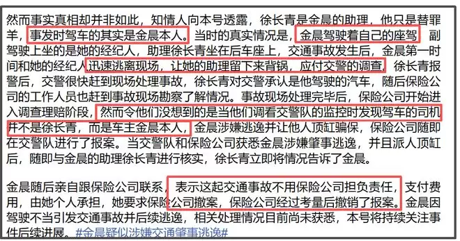 然而,娱记爆料事故认定书陈述的案情并非事实真相。知情人称徐长青是金晨助理,驾驶车辆发生事故的是金晨本人,事发时徐长青坐在后排车座,副驾坐的是金晨经纪人,之后金晨与经纪人离开,让徐长青留下应付交警调查,徐长青报警后,交警很快过来处理事故,保险公司也赶赴现场了解情况。