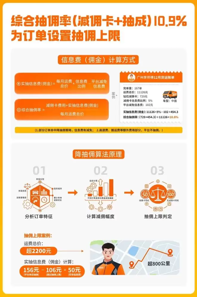 内容显示,平台对于用户出价单、顺路单、拼车单等特定订单类型、100公里以上订单等实行降抽,并且每笔订单都有抽佣上限。未使用减佣卡的司机抽佣上限是100元/单,使用减佣卡的司机抽佣上限则为50元/单。根据货拉拉数据显示,2025年,货拉拉在降抽佣上累计让利达2.6亿元,减佣卡加抽成综合抽佣率从2024年的12.2%降低至10.9%。