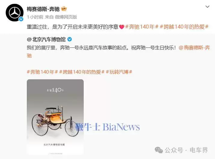 吉利汽车特别强调了来自中国车企的全球领跑者地位,以“来自中国汽车全球领跑者的‘吉’时祝福”表达祝贺。奔驰方面则回应道“借你‘吉’言,奔驰路上,吉利相伴”,既体现了文化共鸣,也彰显了开放的胸怀。北京汽车博物馆同步晒出了展馆中的“奔驰一号”实车照片,为这场行业庆典增添了历史的厚重感。