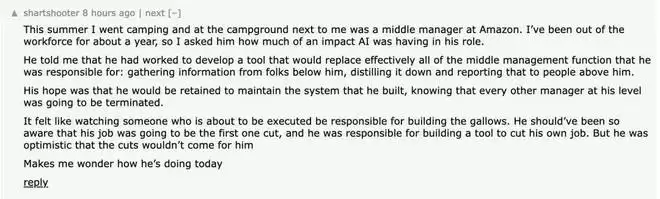 一位网友透露,去年夏天他在露营的时候偶遇一位亚马逊中层经理,彼时该网友已经离开职场大约一年了,所以他询问这个经理,AI 到底对他的工作产生了多大影响?