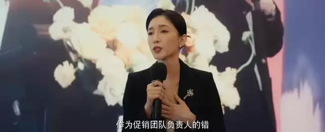 李东明的妻子赵玫(江疏影饰演),在古斯特促销员大会上鞠躬道歉,就意味着公司销售总监许云天(王耀庆饰演)性骚扰一事,不仅赵玫有责任,公司也有责任。