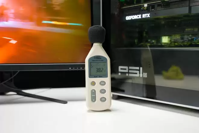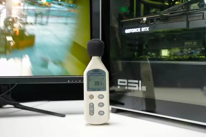 更值得注意点是显卡温度,在整个测试阶段,显卡平均温度仅为59度,只能用冷静得可怕来形容。而在测试过程中,小雷也拿了个噪音仪放在机箱旁边,录得的最高噪音为38.2db,最低值为36.7db,当然这是用“大力水手(DLSS)”减轻显卡压力后的情况。