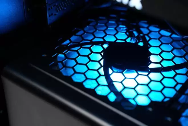 此外,Area-51还用了日常装机中不常用的全进风正压风道,通过把所有风扇设置为进气扇且不设置排气扇的设计,让机箱内部形成正压,逼迫热空气主动从机箱背面的镂空蜂巢状格栅网排出。