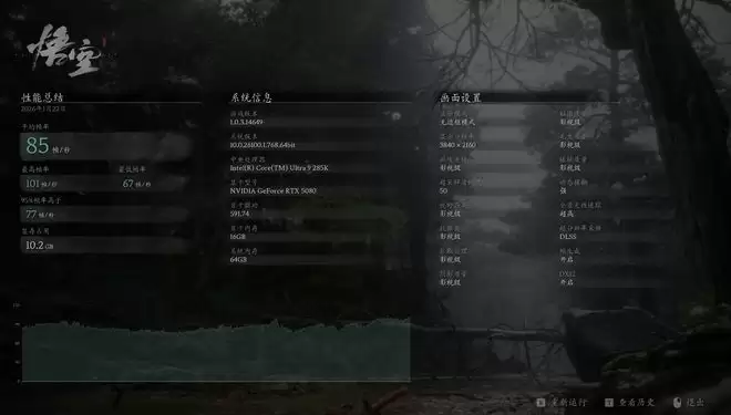 首先是《黑神话》,虽然经过一年多的更新后《黑神话》的优化好了不少,但是作为一款虚幻5引擎打造的光追游戏,仍然是妥妥的“显卡杀手”,而在4K分辨率+影视级画质+超高全景光追的设置下,性能测试给出的平均帧为85fps,最低帧为67fps,95%帧为77fps,结合另一个性能检测软件的数据,1%Low帧为68帧,显卡温度最高67度,平均64度。