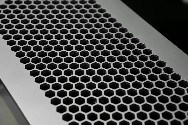 而在顶部的散热面板上,Area-51也做了一个大胆的设计,用大面积的蜂窝散热孔搭配可拆卸的防尘网,同时兼顾了美观和散热效率的需求。老实说,看到这个大面积蜂窝散热孔的时候,我第一时间就想到了苹果的Mac,果然贵的东西都有相同的设计喜好?