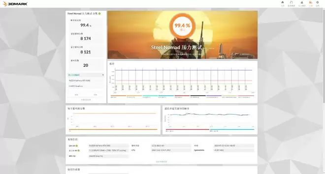 在Steel Nomad测试里,Area-51跑出了8475的成绩,从3DMARK提供的基准线来看,大概差了3%,基本是持平基准线了,如果用英伟达app手动超频一下,估计就能高于基准线。