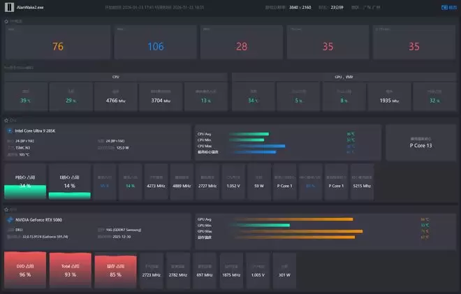CPU:英特尔酷睿Ultra 9 285K(8P+16E的24核设计,最高睿频可达5.7GHz)显卡:DELL RTX 5080内存:镁光DDR5 32GB*2主板:Alienware定制款Z890(支持CPU手动超频)硬盘:海力士PC811 2T(实测4K随机读取88.21MB/s,写入302MB/s)电源:Alienware 1500W白金电源CPU散热:Alienware定制360水冷机箱散热:Alienware定制散热风扇