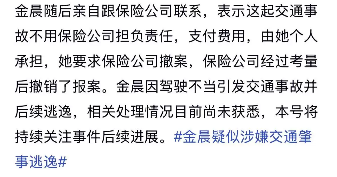 之后,金晨还亲自前往保险公司处理善后事宜。她主动表示无需保险公司负责,所有费用由其个人承担,并要求保险公司予以撤案。