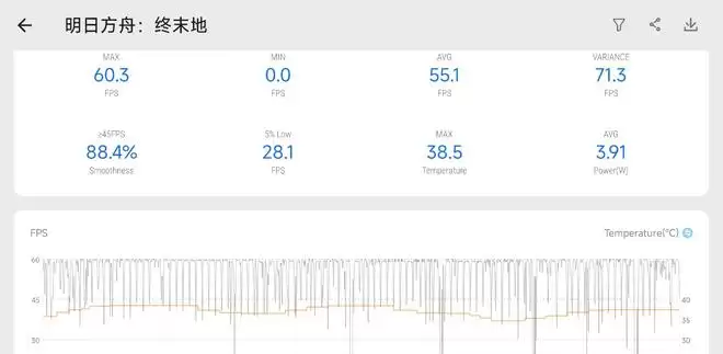 或许是由于新游戏调度上的问题,终末地的表现非常不稳定,游戏在大部分情况下确实能跑在60帧,但是会随机出现掉到45帧的情况,而且整机功耗上不去,最终平均帧率定格在55.1帧。