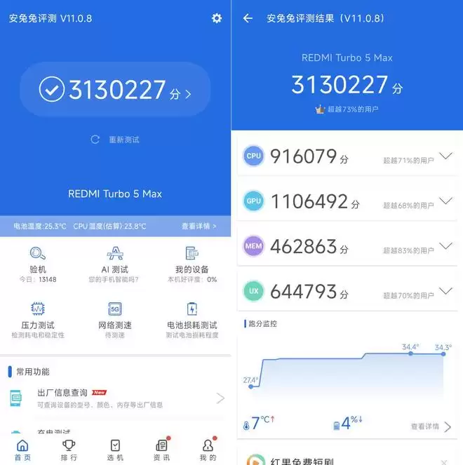 总之,安兔兔跑分咱们简单带过,室温25度环境下,随手一跑就是313万分。