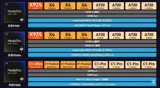 熟悉数码圈的朋友都知道,带“s”的往往是提频版或者特定优化版,定位介于标准版和顶级旗舰之间,而REDMI首发的这颗芯片,虽然也是天玑9500的辈分,但就从性能而言,似乎叫做天玑9400++ 更为合适。