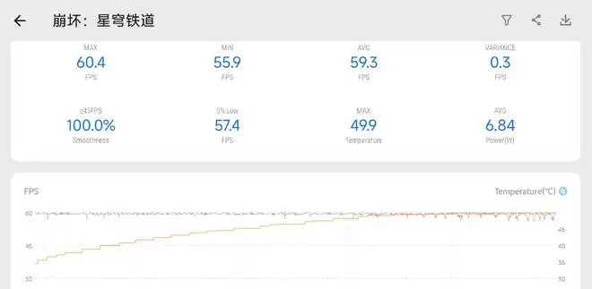 至于目前公认的硬件杀手《崩坏:星穹铁道》,半小时下来也有59.7帧。