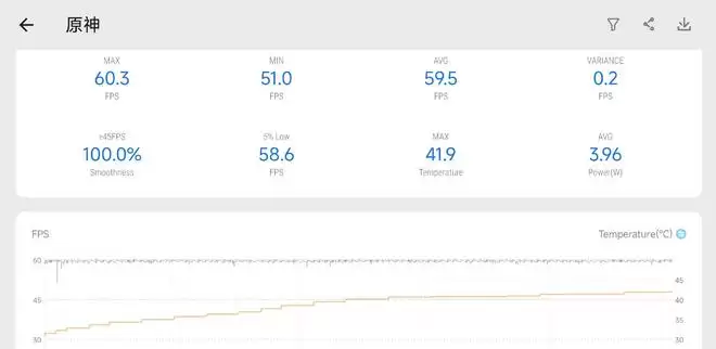 Turbo 5 Max的《原神》调教策略挺有意思,并不会像友商那样跑到60帧以上,以此来偷取平均帧数,30分钟下来,平均帧数达到59.5帧,功耗只有不到4W,机身背面温度控制在40°C左右。