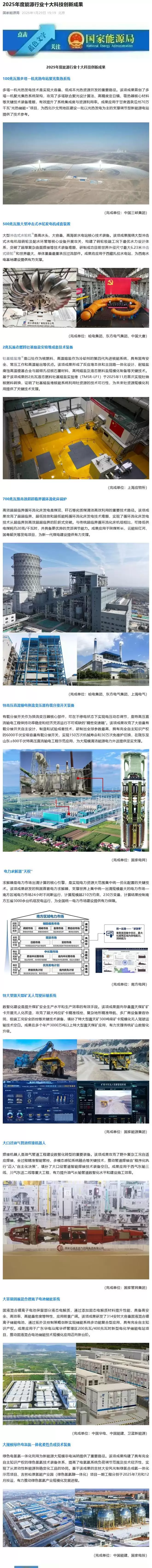 IT之家 1 月 29 日消息,国家能源局公布 2025 年度能源行业十大科技创新成果,涵盖光热发电、大型水电、钍基熔盐堆、高效煤电、特高压、电力市场、无人矿山、智能焊接、新型储能及绿氢合成氨等领域。多项成果已成功应用,为能源安全和绿色转型提供关键技术支撑。
