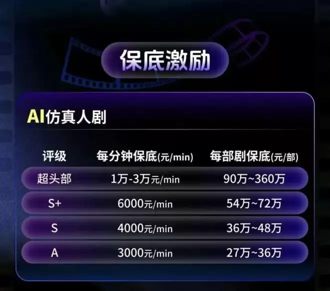 该激励计划主要包括保底激励与免费流量两种形式。针对不同品类与评级的作品,保底金额按分钟及单剧设置,单部最高可达90万至360万元,每分钟10000-30000元的保底激励,最低为每分钟3000元。