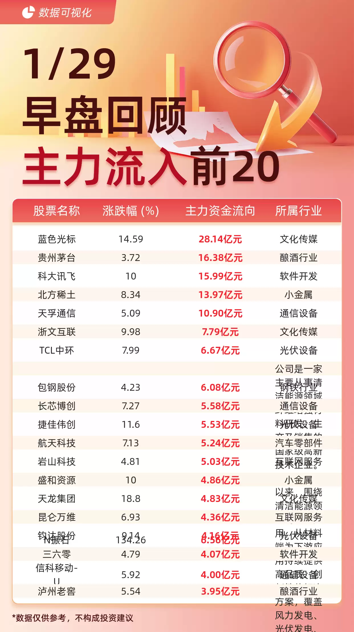 根据交易所最新披露的数据,1月29日午间收盘前,A股市场主力资金呈现出显著的分化格局。以蓝色光标、贵州茅台、科大讯飞为代表的20只个股成为资金追逐焦点。其中蓝色光标以28.14亿元净流入额位居榜首,较第二名贵州茅台高出近12亿元,形成明显断层优势。