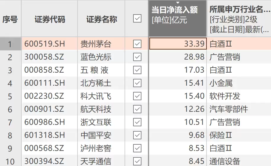 市场监测机构Choice发布的最新数据显示,1月29日当天,A股市场的资金流向呈现出明显的分化趋势。有十只个股获得主力资金的集中净流入,其中白酒行业龙头贵州茅台以超过33亿元的净流入额位居榜首,另一高端白酒企业五粮液则以17亿元的净流入规模紧随其后。