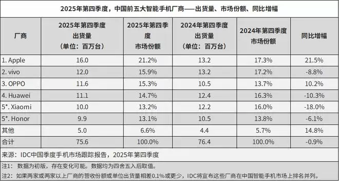 根据IDC数据,2025年四季度,苹果以21.2%的市场份额断档式领先,第二名vivo份额为15.9%,同比增幅也是前五厂商中最高的。2025年全年,苹果出货量位列国内市场第二,与第一名华为的出货量差距仅为数十万台。