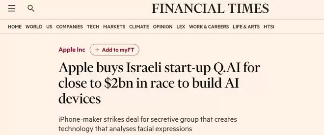 就在今天,据英国《金融时报》报道,苹果以近20亿美元(约合人民币140亿元)的价格收购了一家以色列AI创企Q.AI,该公司核心技术是分析面部表情以理解“无声语言”,这是苹果公司历史上的第二大收购(第一大为2014年30亿美元收购Beats),AI领域的最大收购。