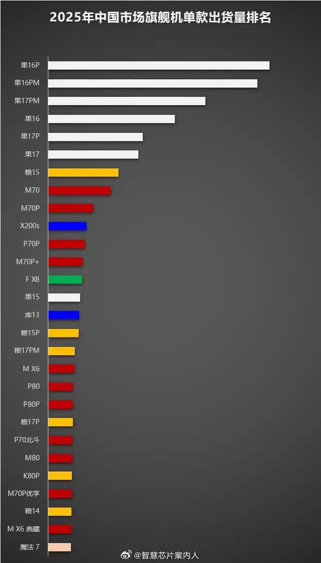 根据知名数码博主统计的一份中国市场旗舰机单款出货量排名,2025年出货量超过百万的机型大约有28款,其中苹果iPhone 16系列和iPhone 17系列六款机型独占TOP6。