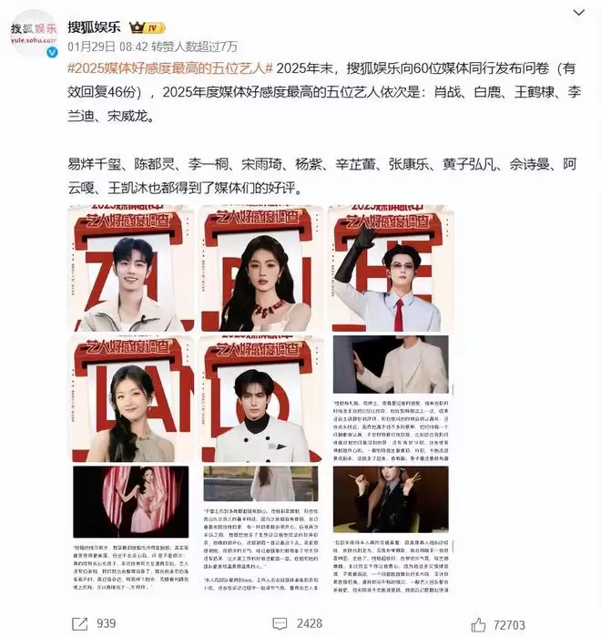 近日某最新大娱公布了一则问卷,评出25年度媒体好感度最高的几位艺人,大家看看分别是谁!
