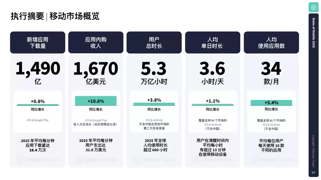 移动端用户使用时长仍在稳步攀升。2025年,消费者在App Store与Google Play应用中的总使用时长达到5.3万亿小时(同比增长3.8%),相当于每位移动用户平均每天使用约3.6小时。