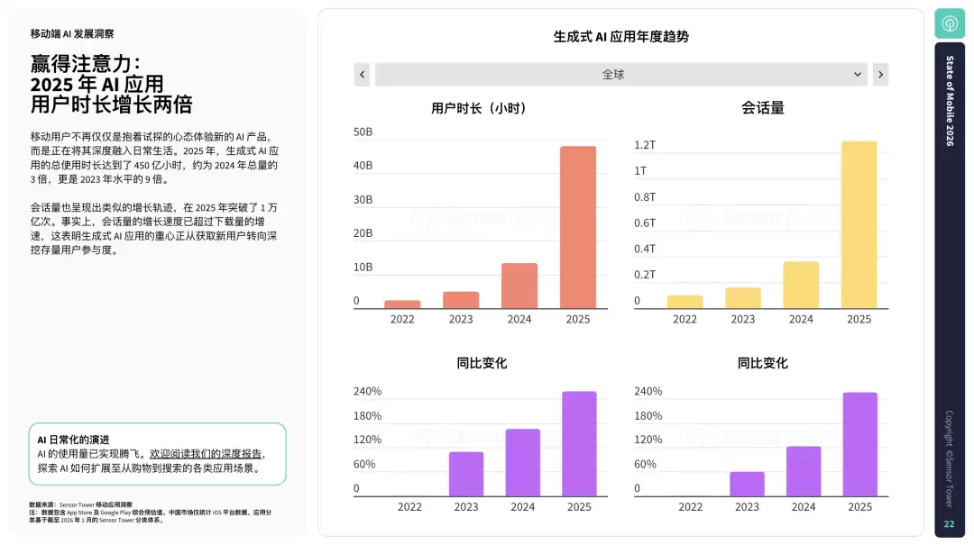 用户会话量呈现同步高增长态势,全年突破1万亿次。值得注意的是,会话量的增速持续高于下载量增速,进一步表明生成式AI应用的行业增长逻辑,已从追求用户规模扩张转向对既有用户使用深度与参与频率的持续深耕。