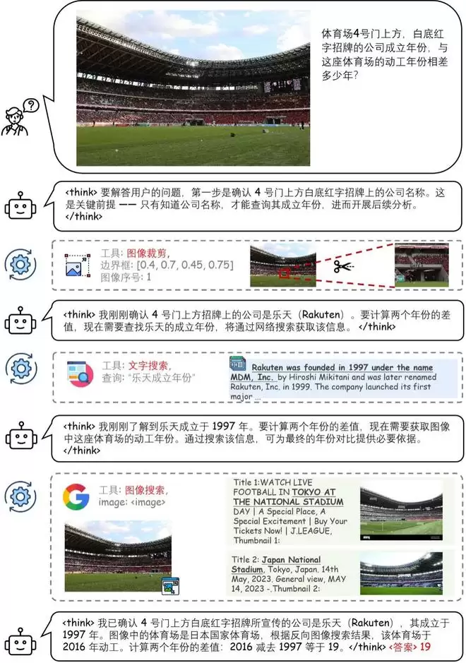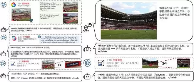 该框架能够在多轮推理过程中主动运用图像搜索、文本搜索和图像裁剪工具,如通过放大、裁剪图片寻找细节,然后调用文本、图片搜索工具查询背景信息,且这一过程无需人工干预。