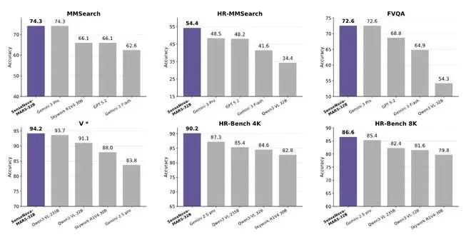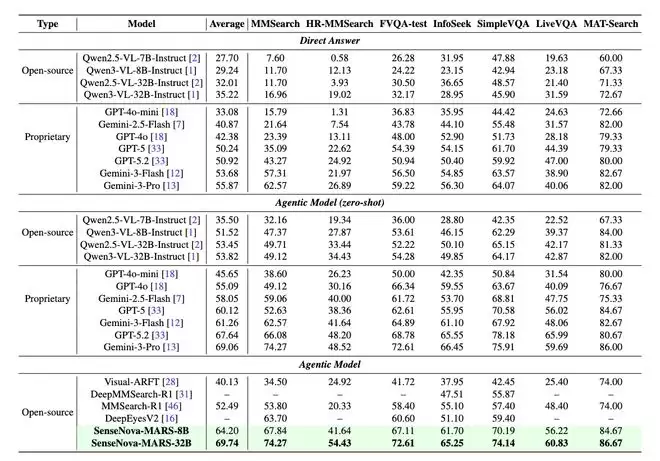 SenseNova-MARS-32B在六项基准测试中与其他模型的整体性能对比显示,MMSearch、HR-MMSearch和FVQA等搜索导向型基准测试中,该模型超越了Gemini-3-Pro和GPT-5.2等专有模型。