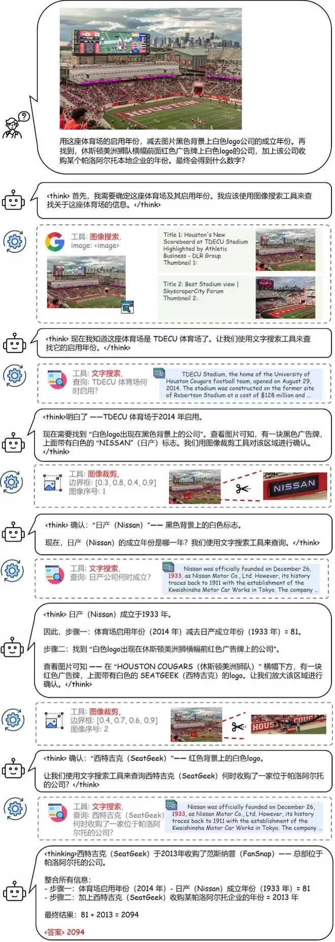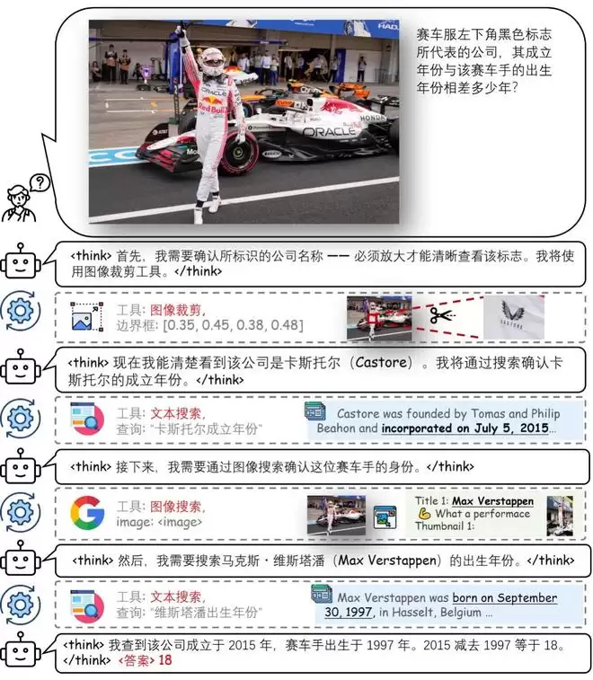 下方模型需要完成识别赛车服微小Logo、查询公司成立年份、匹配车手出生年月、计算差值的复杂任务,SenseNova-MARS可自主调用图像裁剪、文本/图像搜索工具,无需人工干预完成解答。